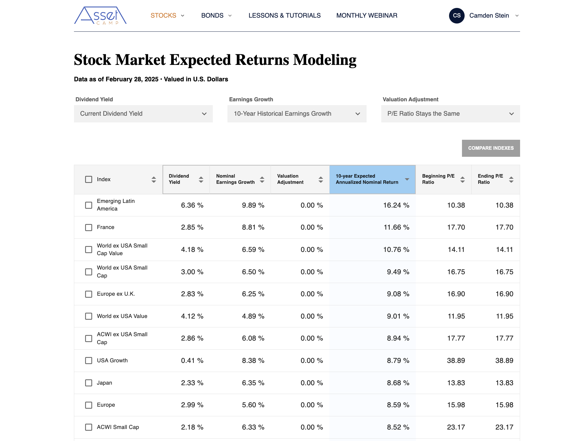 Model Expected Returns for Stock and Bond Indexes