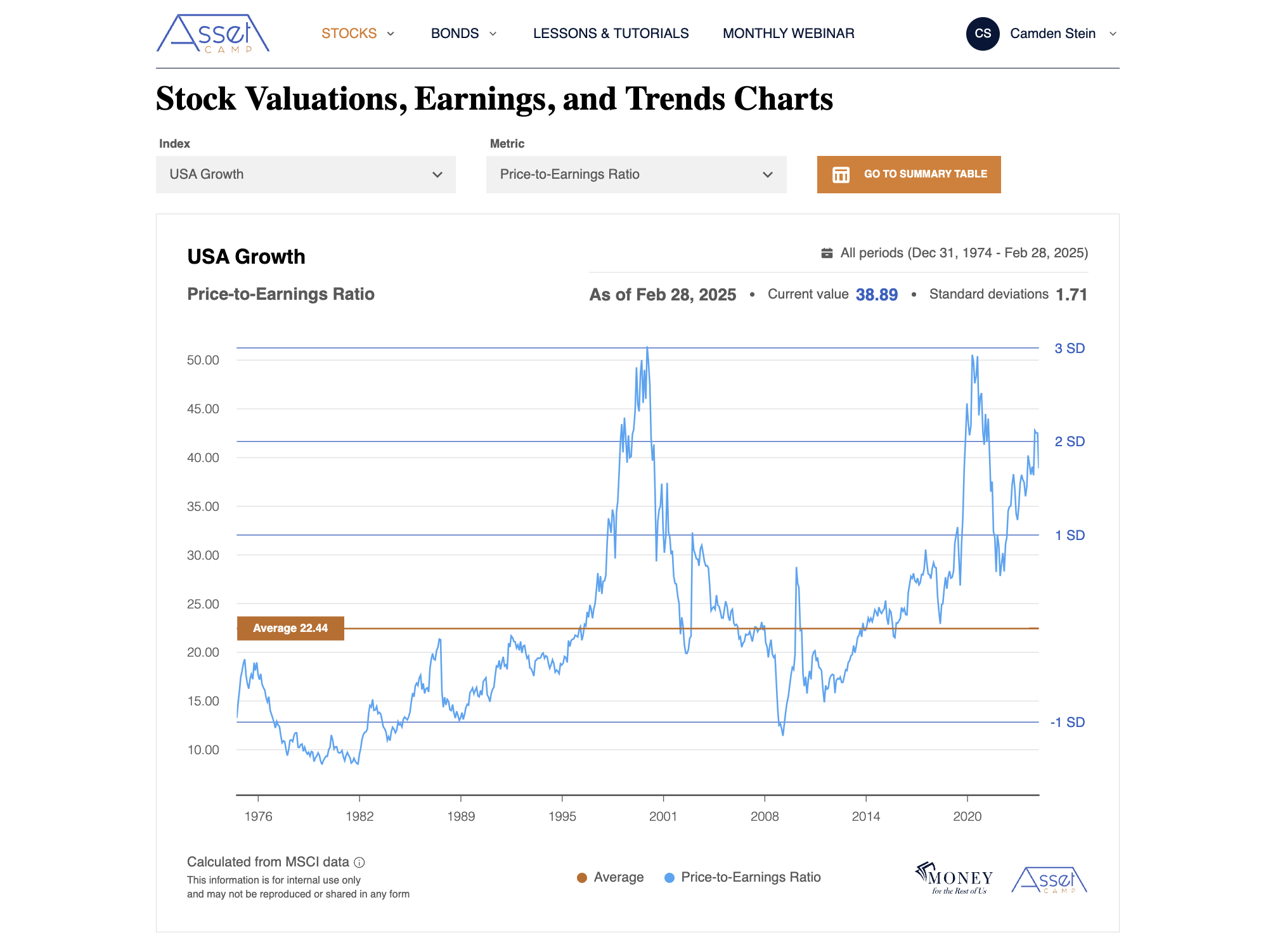 • Historical data, averages, and standard deviation bands on 74 stock and bond indexes, covering 99% of the investable market